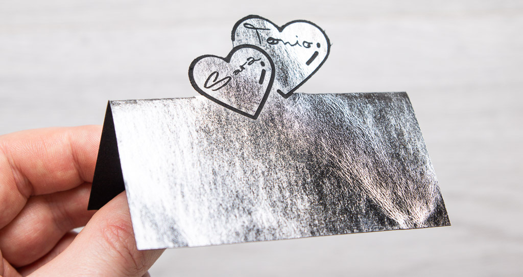 Tarjeta de mesa plateada para personalizar de FloraPap grabada. Cambie los nombres en el configurador.