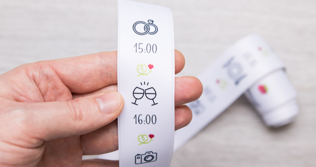 Puede personalizar los motivos y la hora en el configurador. Cinta de raso de 35 mm de ancho, por ejemplo como cinta de mesa con agenda impresa.