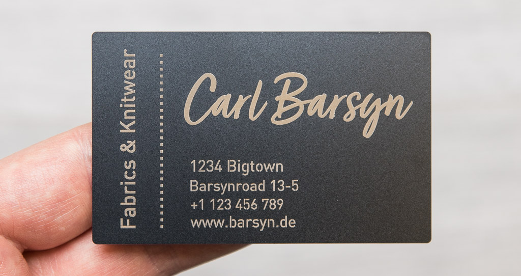 Tarjeta de visita de calidad superior de acero inoxidable con revestimiento de titanio en negro, 80 x 50 mm - simplemente personalizar en línea.