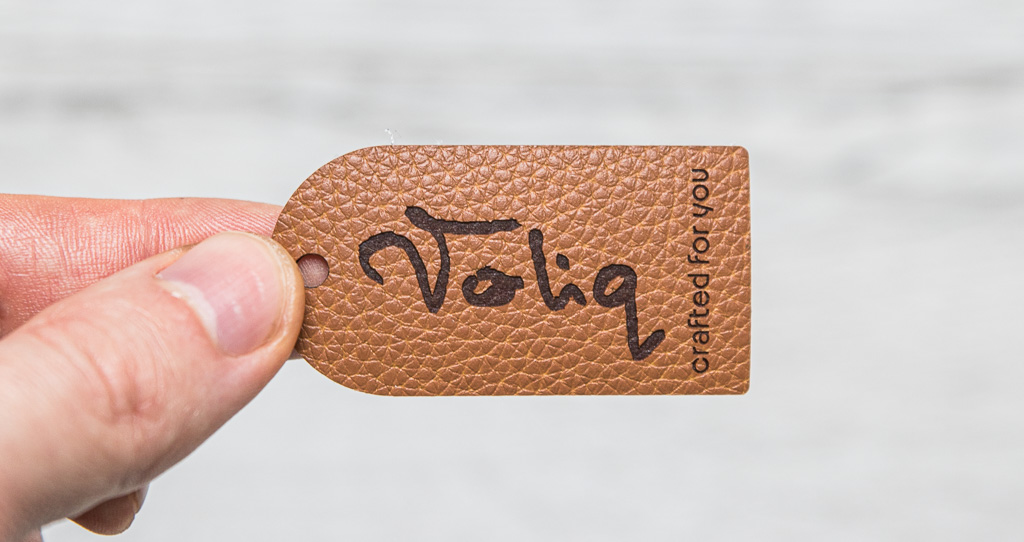Etiqueta de algodón orgánico para coser doblada en prendas hechas a mano. Personaliza ahora.